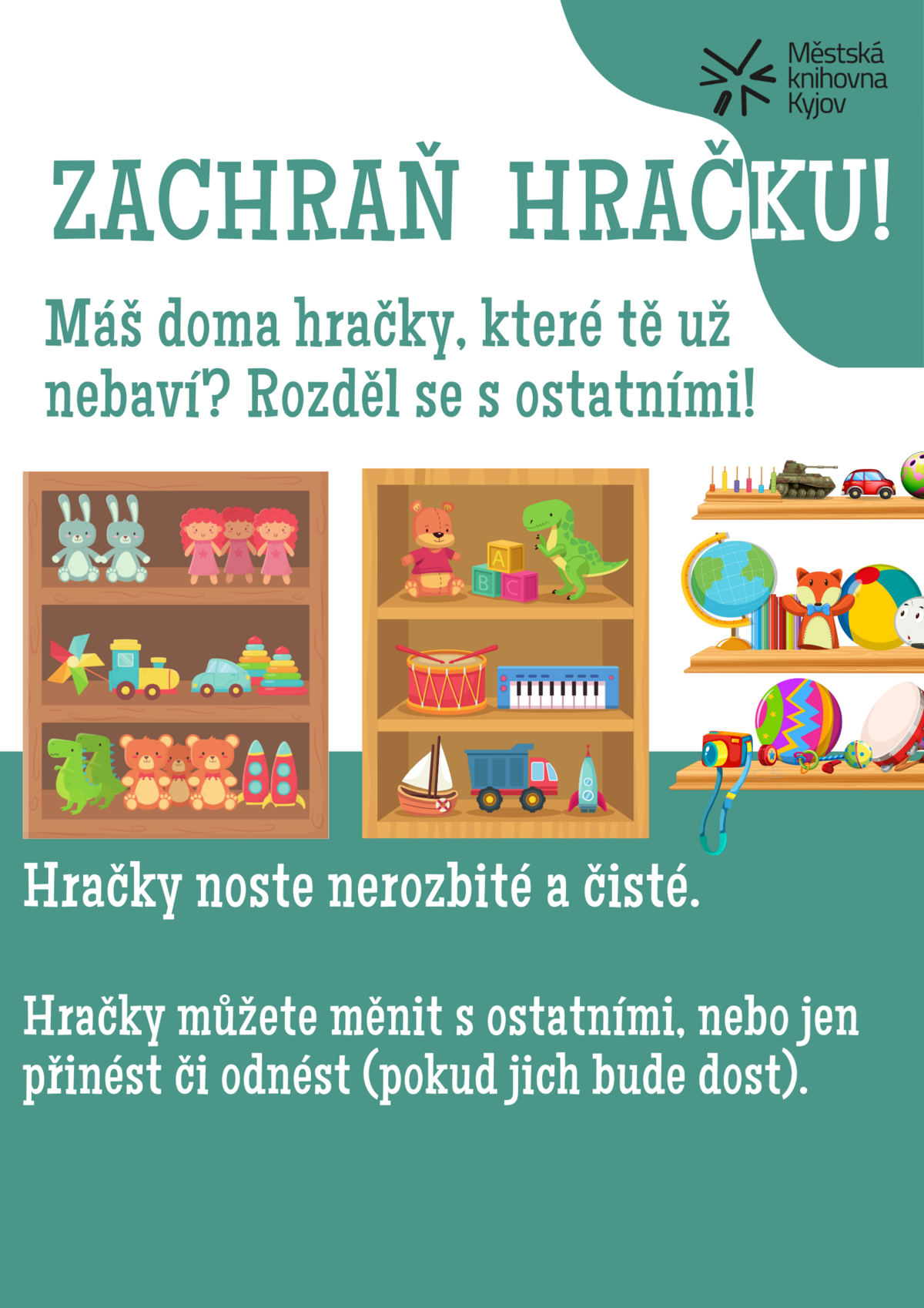 Velkým tématem (nejenom v knihovnách) je v poslední době také udržitelnost a najdete tak u nás SWAP ZACHRAŇ HRAČKU, který bude tentokrát určený hračkám, jak správně napovídá název. Doma se sejde ledacos a ne se vším si naše ratolesti vyhrají. Někdy je nám ale líto všechno „jen tak“ vyhodit. Právě pro tyto případy nabízíme alternativu. Zastavte se v našem swapovém koutku a nabídněte hračky, se kterými si vaše ratolesti už nehrají, případně (bude-li možnost) hračky prostě vyměňte.